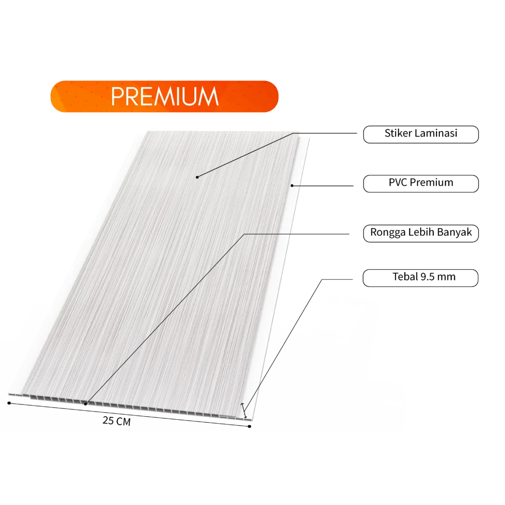 Bahan : PVC Panjang : 4, 5, 6 Meter Lebar : 250 mm Berat : 460 gram/m Isi Perdus : 15 lembar
